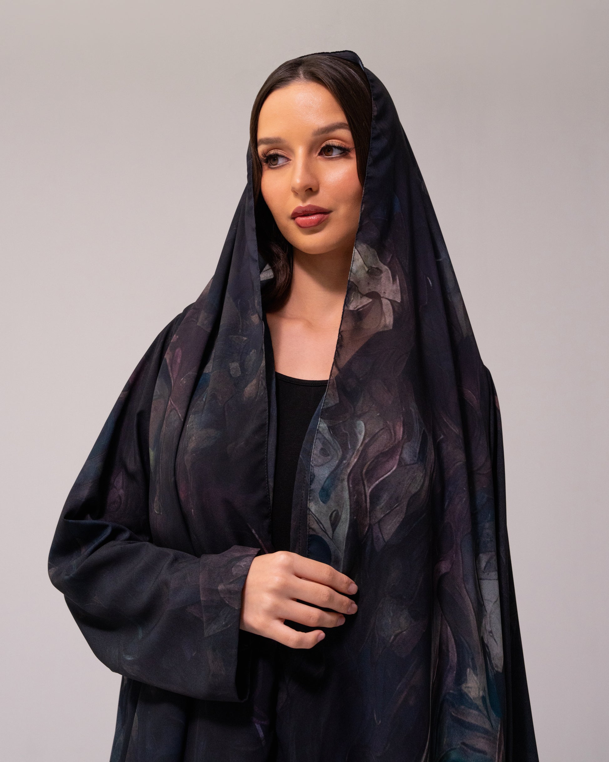 A print that flows like a quiet night breeze, draped in sheer elegance with painterly strokes that appear almost hidden within the black fabric. Double-printed on Le múje fabric and comes with a matching shaila.
